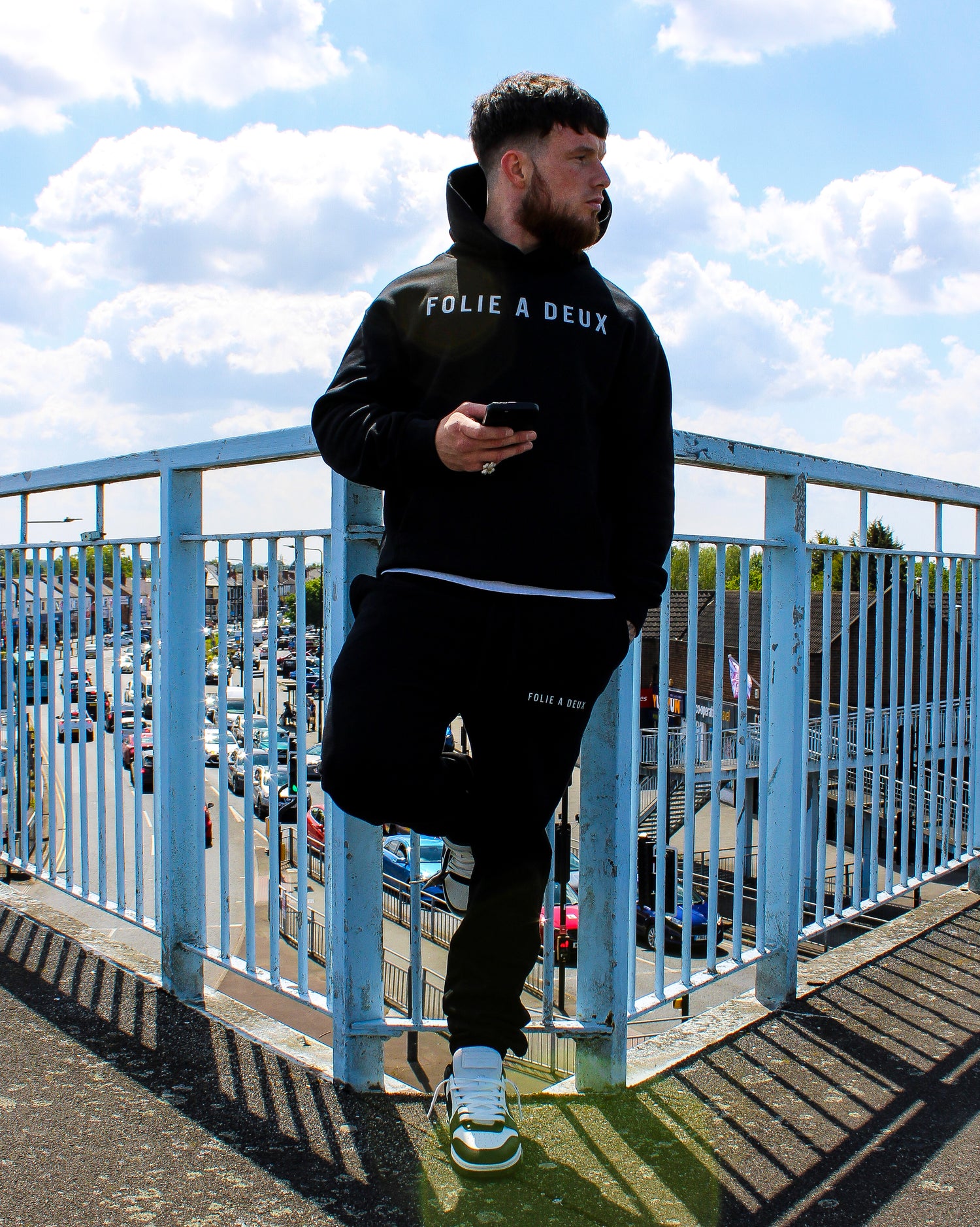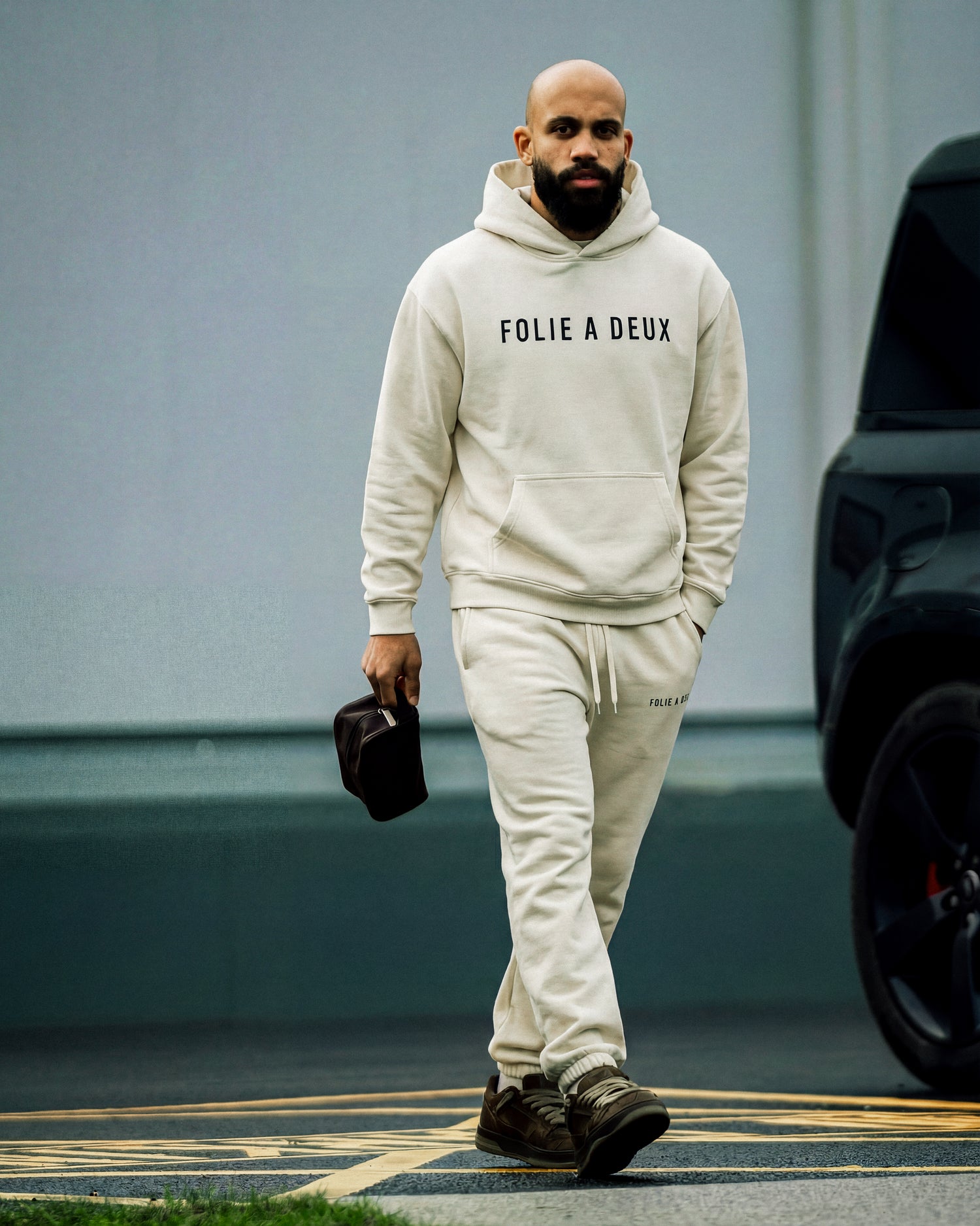 Former footballer and current model / content creator was spotted and created content in our cream and black heavyweight tracksuit.