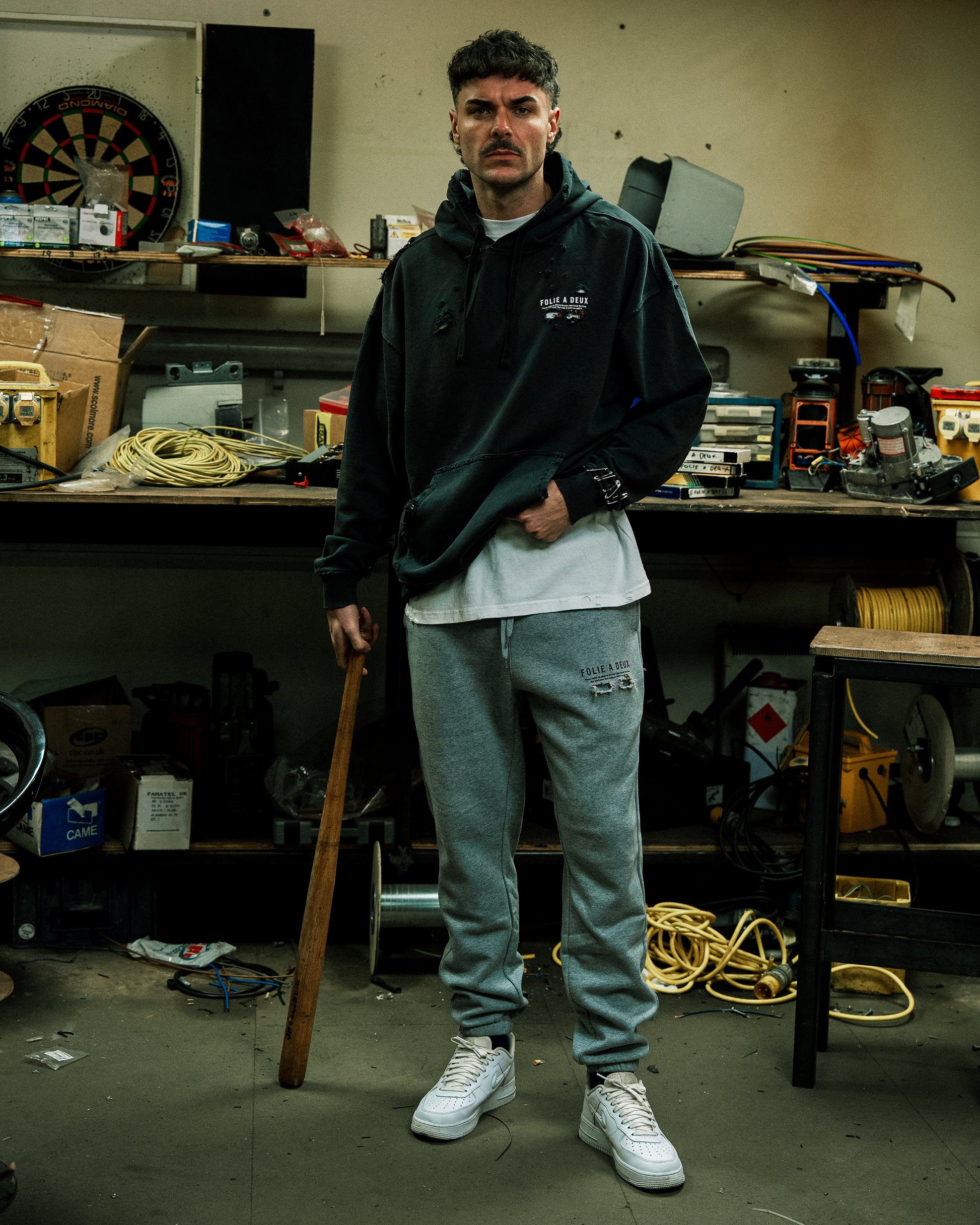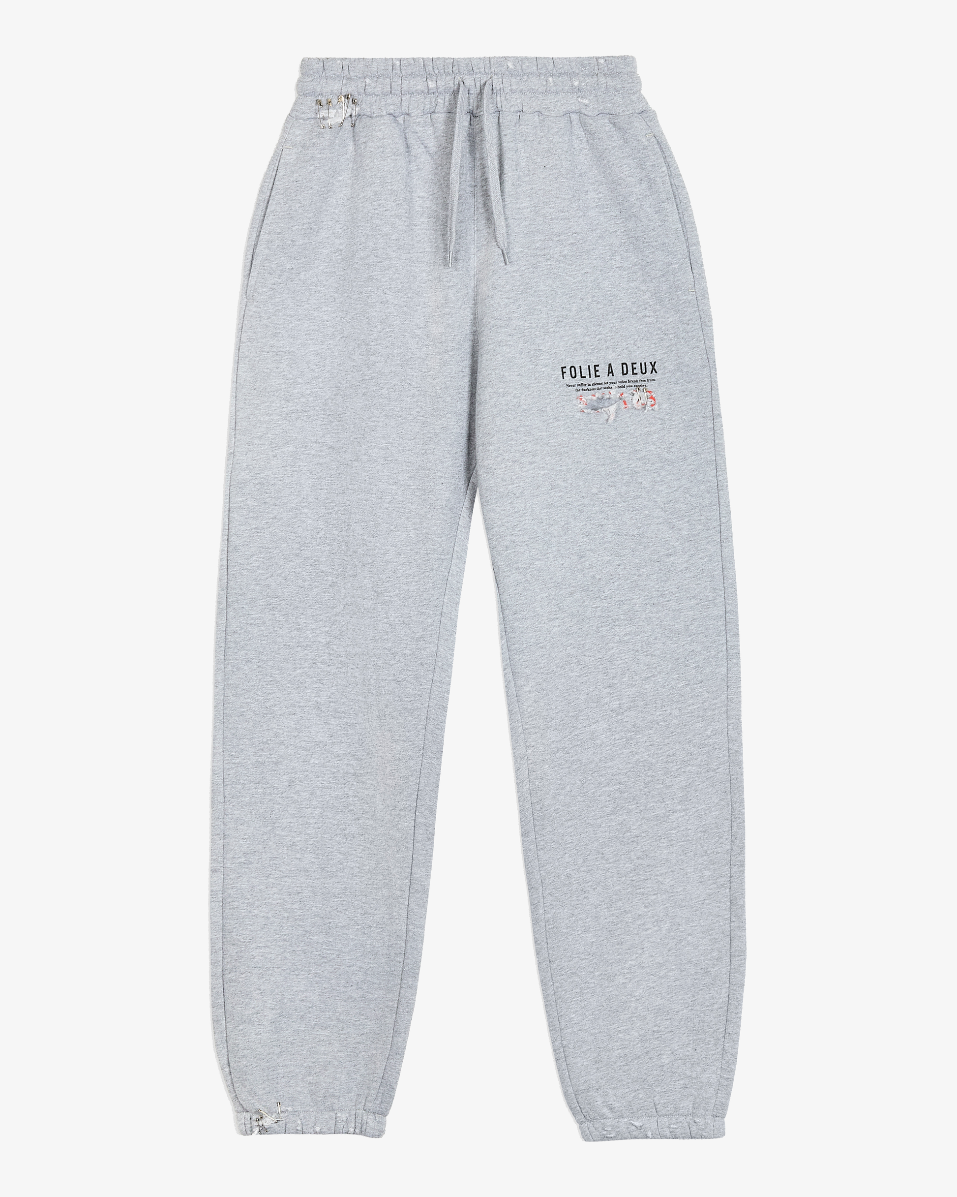 The Folie A Deux “Re-Worked” Sweatpants in Vintage Grey takes its name from a recent misinterpretation and has been re-worked and hand crafted with detailed distressing, heavy duty safety pin locks and self inflicted blow out holes. The Sweatpants features a 350gsm heavyweight style, crafted with a blend of 80% cotton & 20% recycled polyester anti-pill fleece, to provide a regular fit with additional body & structure. Branding is represented in a screen printed Folie A Deux logo on the front and back.